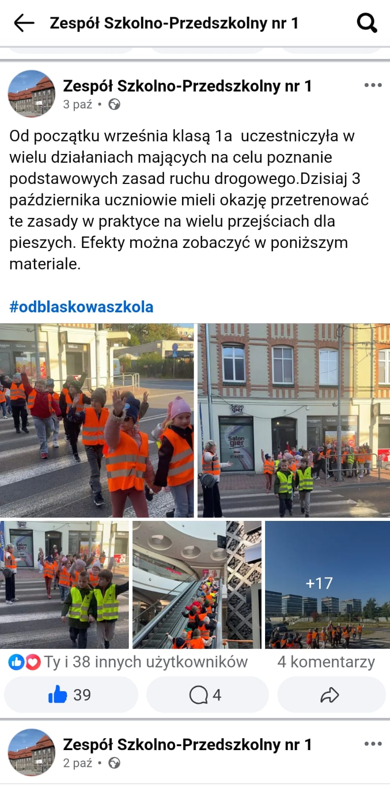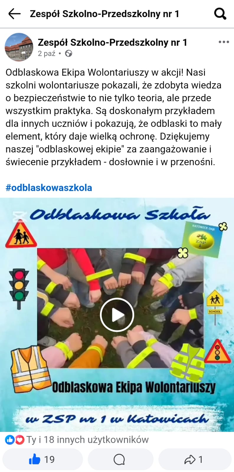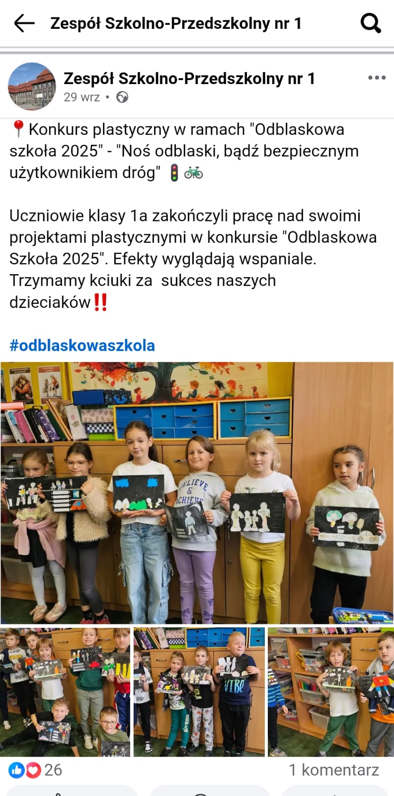 W ramach zajęć pozalekcyjnych w naszej szkole przeprowadzono akcję „Oklaski za odblaski”. Działania poprzedzone były projekcją filmu edukacyjnego dotyczącego zasad bezpiecznego poruszania się po drodze oraz wspólnym przygotowaniem gazetki szkolnej promującej noszenie elementów odblaskowych. Podczas akcji uczniowie i nauczyciele nagradzali brawami tych, którzy pamiętali o założeniu kamizelki odblaskowej lub zabrali ze sobą element odblaskowy, które później wykorzystali na gazetkę. Dzięki tej inicjatywie dzieci w przyjaznej i radosnej atmosferze uczyły się, że odblaski to nie tylko obowiązek, ale również powód do dumy. Akcja miała charakter motywujący i integrujący całą społeczność szkolną, a także wzmocniła pozytywne nawyki związane z bezpieczeństwem na drodze.